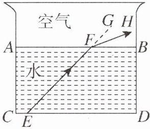 18. 光线在不同介质中传播速度不同,从一种介质射向另一种介质时会发生折射.如图,水面$AB$与水杯下沿$CD$平行,光线$EF$从水中射向空气时发生折射,光线变成$FH$,点$G$在射线$EF$上,已知$∠HFB=20^{\circ },∠FED=45^{\circ }$,求$∠GFH$的度数.