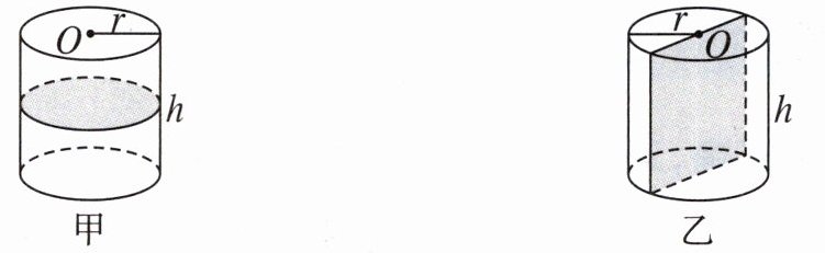 6. 如图是对同一个圆柱(底面半径为 r,高为 h)的两种不同切法(都是切成相同的两块)。甲种切法,表面积的和比原来增加(