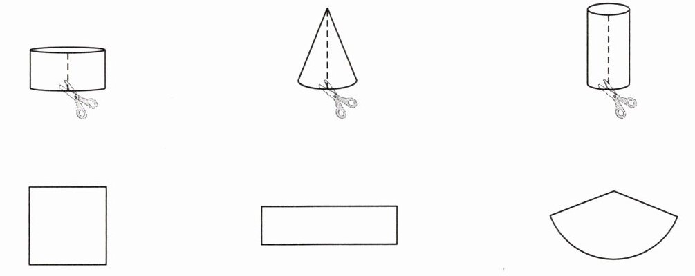五、将上面物体的侧面沿虚线剪开所得到的图形是什么?连一连。
