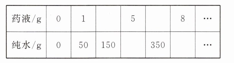 3. 一种消毒水是按药液和纯水的质量比为$1:50$的比例配制而成的,请根据这个关系完成下表。