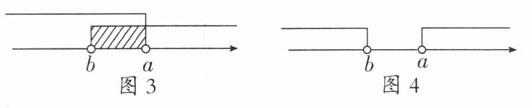 若未知数的取值比大数小,比小数大,则不等式组的解集在两数之间,取公共部分(如图3);所以在图3中,不等式组的解集为$b<x$或$x<a$.