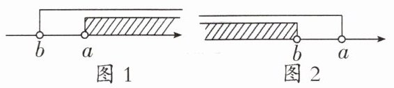 对这类不等式组可按“同大取大,同小取小”的法则,即取公共部分为它的解集(如图1).所以在图1中,不等式组的解集为$x>a$,在图2中,不等式组的解集为$x<b$. (