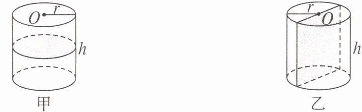 6. 如图是对同一个圆柱(底面半径为r,高为h)的两种不同切法(都是切成相同的两块)。甲种切法,表面积的和比原来增加(