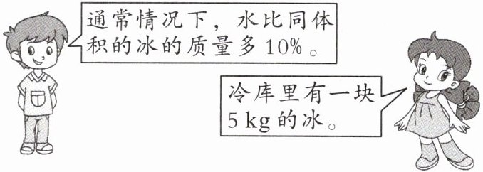 【解析】:把冰的质量看作单位“$1$”,因为水比同体积的冰的质量多$10\%$,所以水的质量是冰的$(1 + 10\%)$。已知冰的质量是$5$千克,求水的质量,用冰的质量乘以$(1 + 10\%)$,即$5×(1 + 10\%) = 5×1.1 = 5.5$(千克)。