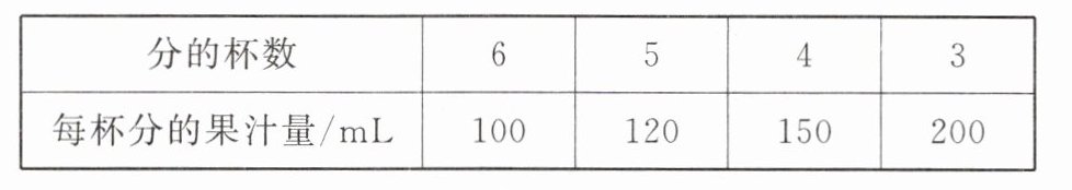 分的杯数$\times$每杯分的果汁量$ = 6\times100 = 5\times120 = 4\times150 = 3\times200=600$(一定),也就是分的杯数和每杯分的果汁量对应的乘积一定。