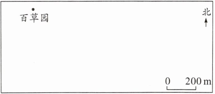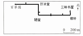 小贤从百草园出发,先向东走400m到达饮冰室,再向南走300m到达陋室,然后向东走500m到达稼轩,最后向北走100m到达三味书屋。在下图中画出小贤的行走路线,并标出各地点的位置。
