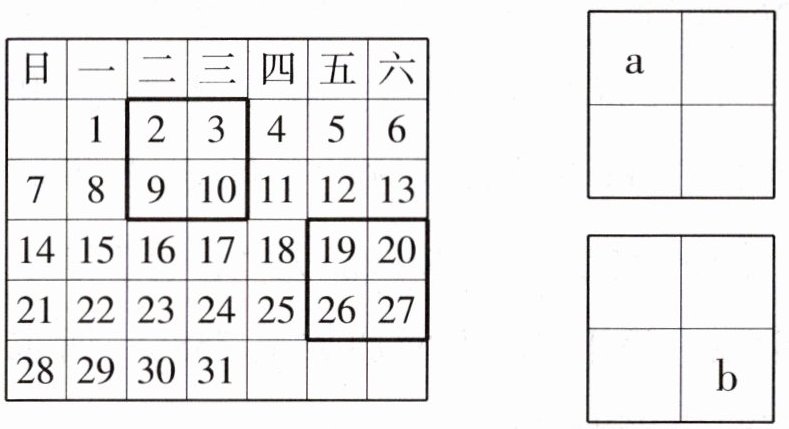 3. 某月的日历如下,用正方形按图中的方法框出四个数。按框出的四个数之间的关系填写下面的空格。