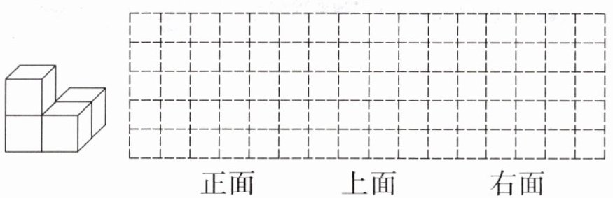 3. 下面的立体图形从正面、上面和右面看到的形状分别是什么?在方格纸上画一画。