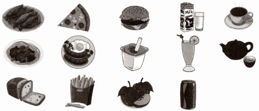 提示:fish,hamburger,apple,milk,bread,egg,chips,breakfast,lunch, dinner...