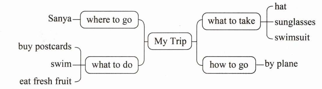 假如你是 Sam,你的暑假生活马上要开始了。请根据下面的思维导图,以“My Trip”为题写一写自己的暑期旅行计划吧! 不少于 40 个单词。$My Trip_____$