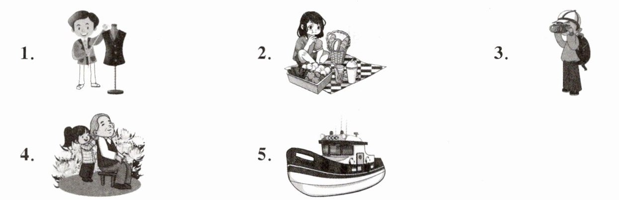 ( )1. $\begin{cases} \text{surf} \\ \text{skirt} \end{cases}$ ( )2. $\begin{cases} \text{visit} \\ \text{China} \end{cases}$ ( )3. $\begin{cases} \text{photo} \\ \text{five} \end{cases}$