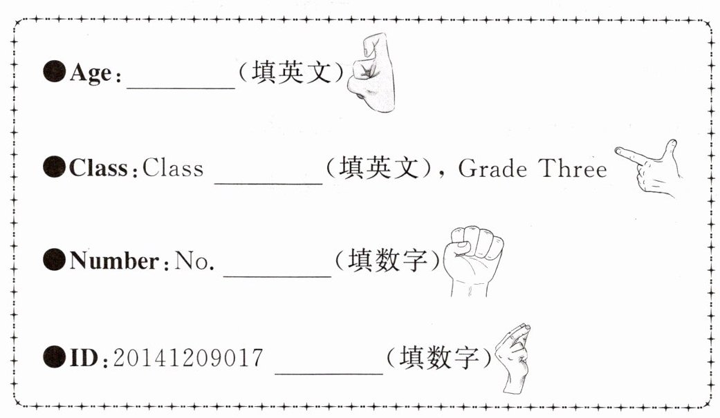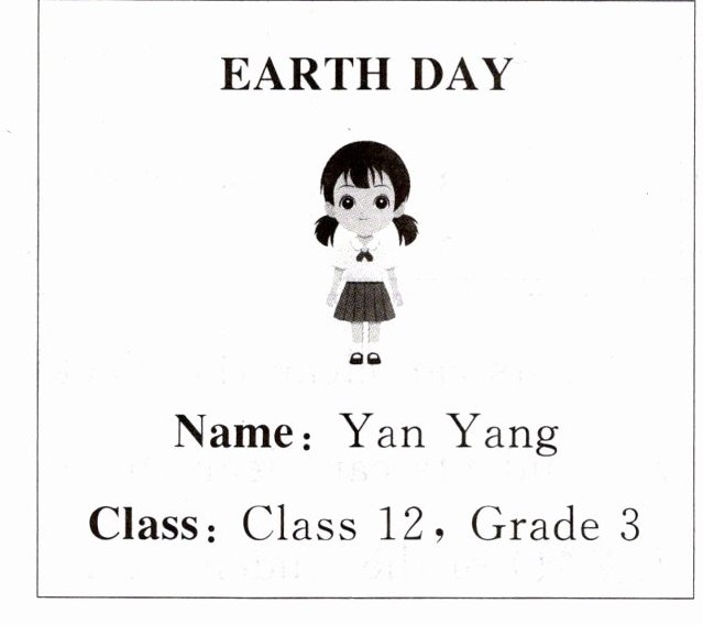 Hello, my name is Yan Yang. I am 1. ____ years old. I am in Class 2. ____, Grade 3. ____. I can clean the 4. ____. I can clean the windows. I can 5. ____ the doors. I can clean my classroom. Let's help the Earth. Let's love the Earth.