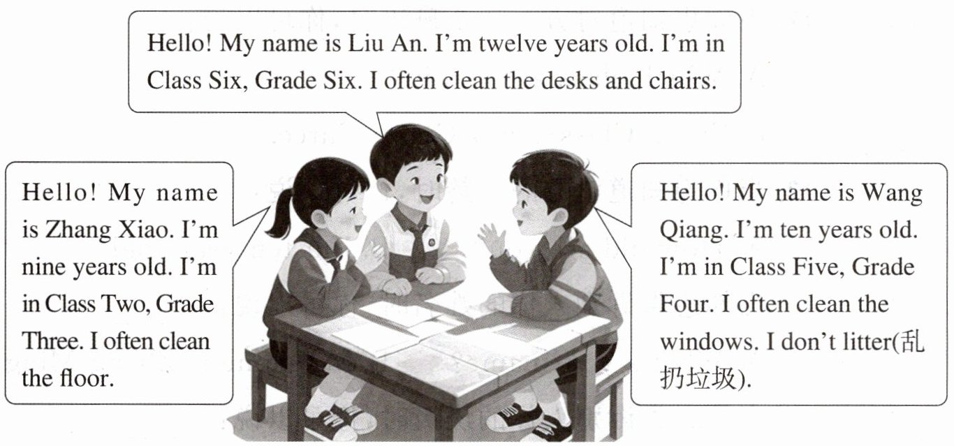 | Liu An | 2. ____ years old | clean the desks and chairs |