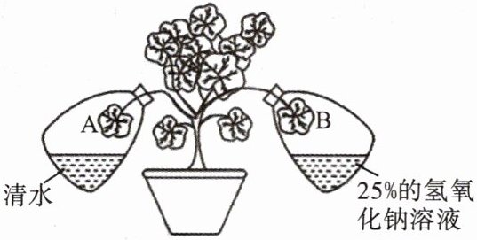 11. 将天竺葵暗处理一昼夜后,选取2片大小相近的叶片A和B,按照右图连好装置(氢氧化钠溶液可以吸收二氧化碳),移到光下4小时,然后取下叶片A和B,脱色处理后,用碘液检验。下列相关叙述错误的是 (