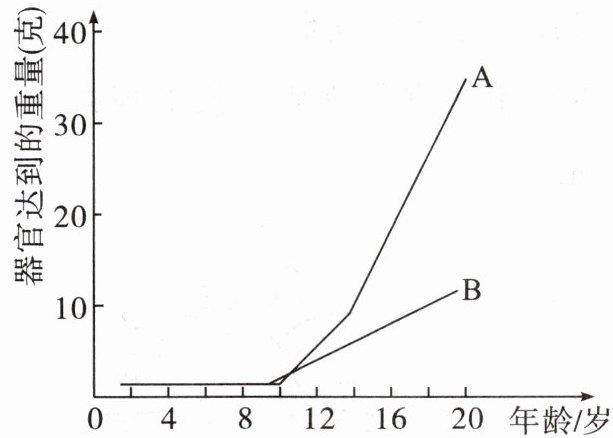 16. 下图是根据男女最主要的生殖器官发育过程绘制的折线统计图,请据图回答问题。