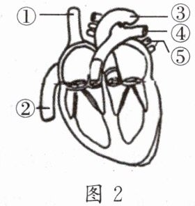 (2)实验 2:如图 2,扎紧血管②,从血管①向心脏灌水,水将从血管[