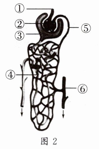 (2) 若尿检后发现尿液中出现血细胞,最可能是因为图 2 中的[