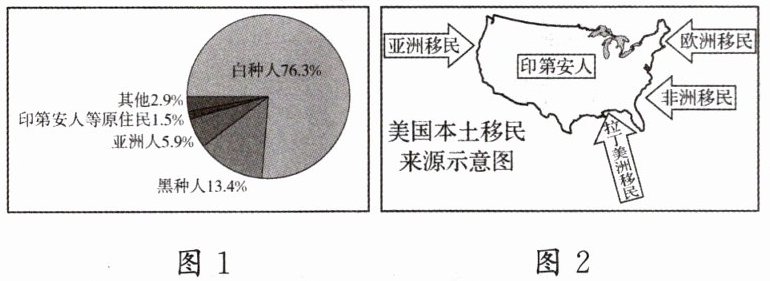 2. 有人说美国是移民国家,也有人说美国文化是“万花筒”。根据图 1 和图 2,下列对美国的种族和文化的叙述,错误的是 (