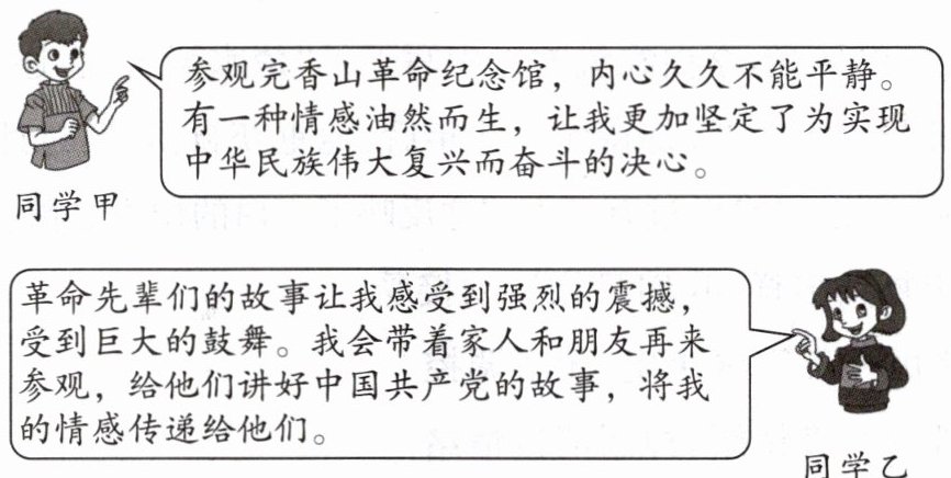同学甲在参观香山革命纪念馆的活动中,获得了为实现中华民族伟大复兴而奋斗的美好情感体验,丰富了自己的情感世界,在情感体验中成长。同学乙在参观中获得积极情感,并且通过打算带家人朋友参观、讲好中国共产党故事来传递情感正能量,在传递情感过程中不断获得新感受,使自己的生命更有力量,在情感体验中成长。