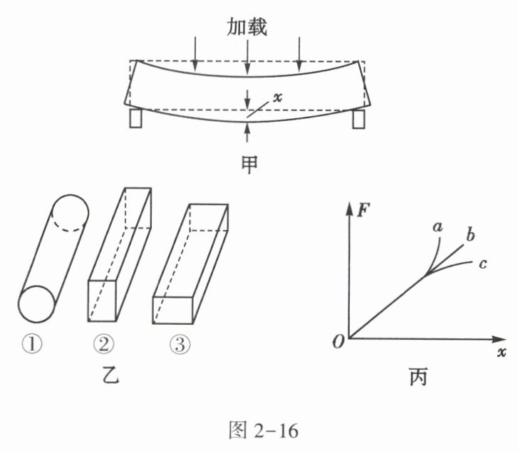 (3) 在木材承重能力测试中,得到压力 F 和形变量 x 的关系图像如图 2-16 丙所示,在 a、b、c 三条图线中,正确的是图线____。