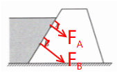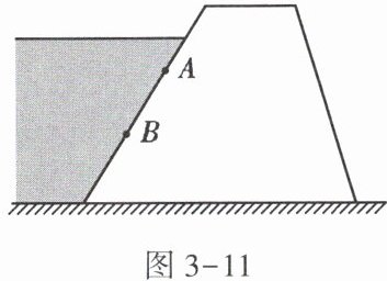 14. 拦河大坝有调水、防洪、发电等功能,大坝设计成上窄下宽的形状,如图3-11所示,请画出水对大坝侧壁面积相同的A、B两处的压力。