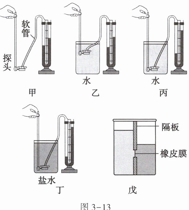 16. 物理课上,同学们利用压强计“探究液体内部的压强”,进行了如图3-13所示的操作。