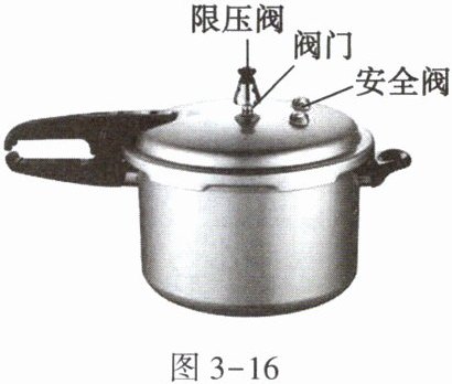 19. 如图3-16所示,高压锅的锅盖上有一个空心柱(排气孔),空心柱上“戴”着一个帽子(限压阀)。当高压锅内气体的压强超过安全值时,其内的气体就会冲出限压阀,排出一部分,使锅内气体的压强减小。现有一个直径为24 cm、空心柱小孔的横截面积为$10mm^{2}$、限压阀质量为100 g的高压锅,要用它来煮饭,已知当时的大气压为$1.0×10^{5}Pa$。(g取10 N/kg)