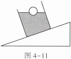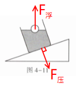 14. 如图4-11所示,一容器静止在斜面上,容器内的水面上漂浮着一小球。请在图中作出容器对斜面的压力$F_{压}$和小球受到的浮力$F_{浮}$的示意图。
