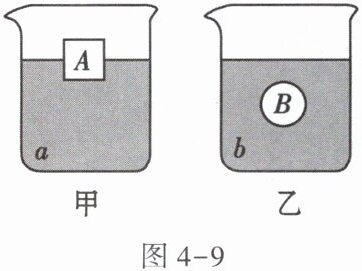 12. (双选)甲、乙两个相同的容器中盛有质量相等的a、b两种不同的液体,现把两个体积相等、材料不同的物体A、B分别放入两液体中。当物体静止时,两容器中液面相平,如图4-9所示。下列说法正确的是()