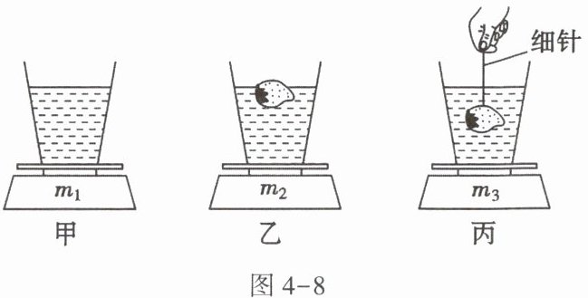 11. 质量为m₀的杯子,装入适量水后放在水平的电子秤上,如图4-8甲所示;接着把草莓轻放入水中,草莓漂浮,如图4-8乙所示;然后用细针将草莓轻压入水中,如图4-8丙所示。水均未溢出,电子秤的示数依次为m₁、m₂、m₃,不计细针体积。下列说法正确的是()