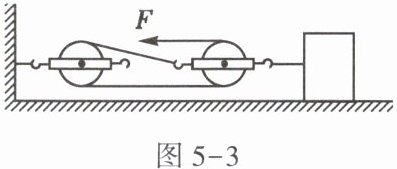 4. 如图 5 - 3 所示,用滑轮组拉动重 200 N 的物体在水平桌面上做匀速直线运动。已知 F = 10 N,滑轮组的机械效率为 80%,则物体与桌面之间的摩擦力的大小为____N。