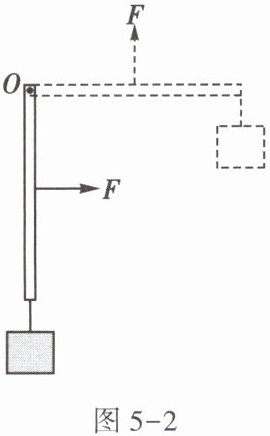3. 如图 5 - 2 所示,一根长为 40 cm 的轻质直杆可绕 O 点转动,杆的末端悬挂重 50 N 的重物,用一个始终跟杆垂直的力 F 作用于杆的中点,并使杆由竖直位置缓慢转到水平位置,忽略摩擦阻力。在这个过程中,力 F 的大小将____(选填“增大”“不变”或“减小”),力 F 所做的功为____J。
