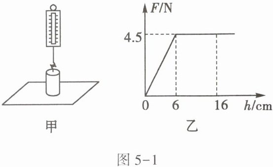 2. 在测量一圆柱体所受的重力时,小吴用弹簧测力计从图 5 - 1 甲所示的位置开始竖直向上缓缓提升,弹簧测力计的示数 F 与弹簧测力计上升的高度 h 之间的关系如图 5 - 1 乙所示,则圆柱体所受的重力为____N。弹簧测力计从开始上升到高度为 16 cm 时,弹簧测力计对圆柱体所做的功是____J。