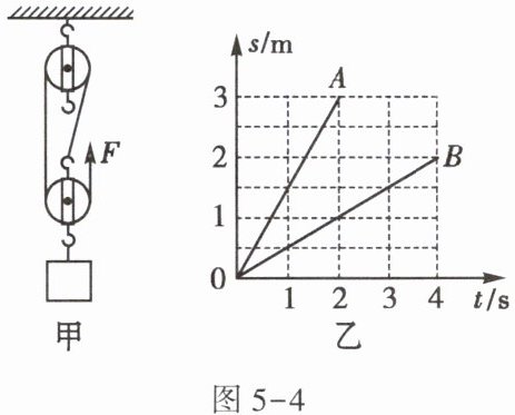 5. 用如图 5 - 4 甲所示的滑轮组提升重 200 N 的物体,已知拉力 F 为 80 N,不计绳重和摩擦,物体和绳子自由端的运动情况如图 5 - 4 乙所示,反映绳子自由端运动图线的是____(选填“A”或“B”)。动滑轮重____N,3 s 内对物体做的有用功为____J。