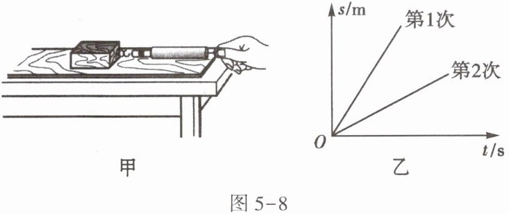 9. 如图 5 - 8 甲所示,小明用弹簧测力计拉动木块,使它沿水平木板匀速滑动,图 5 - 8 乙所示是他两次拉动同一木块得到的距离随时间变化的图像。当木块两次运动的距离相同时,下列说法正确的是 ( )