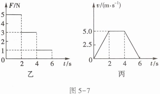8. 如图 5 - 7 甲所示,物体在水平拉力 F 的作用下由静止沿粗糙水平面向右运动,0 ~ 6 s,拉力随时间变化的规律如图 5 - 7 乙所示,速度随时间变化的规律如图 5 - 7 丙所示,则 2 ~ 4 s,物体克服摩擦力做功的功率为 ( )