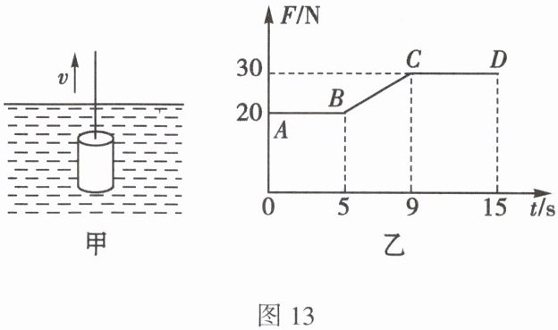 14. (双选)如图13甲所示,一个实心圆柱体金属块在细绳竖直向上的拉力的作用下,从水面下一定深度开始竖直向上以0.1m/s的速度匀速直线运动,上升到离水面一定的高度处(假设水面不动)。如图13乙所示是绳子的拉力F随时间t变化的图像。结合图像中的信息,下列判断正确的是( )