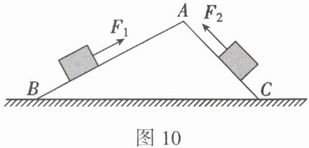 11. 如图10所示,光滑斜面AB>AC,沿斜面AB和AC分别将同一重物从它们的底部以相同时间拉到顶部,所需的拉力分别为F₁和F₂,所做的功分别为W₁和W₂,其功率分别为P₁和P₂,则( )