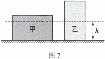 10. 如图7所示,均匀圆柱体甲和乙放置在水平地面上,现沿水平虚线切去部分后,使甲、乙剩余部分的高度均为h。若切去前后,甲、乙对地面的压强变化量相等,则甲、乙原先对地面的压强$P_{甲}$、$P_{乙}$和压力$F_{甲}$、$F_{乙}$的关系是( )
