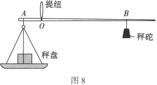 12. 同学们模仿中药房的戥秤制作杆秤,用筷子做秤杆,用钩码做秤砣,用细线将秤盘系在A点。当不挂秤砣且秤盘不放物体时,在O点提起提纽,秤杆水平平衡;当秤盘放90g物体、秤砣移到B点时,秤杆再次水平平衡,如图8所示。在O到B两条刻线之间均匀地画上44条刻度线。下列说法正确的是( )