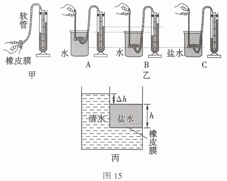 ②在外部大容器内装入清水,直到橡皮膜变平,测出盐水的深度h以及清水与盐水的液面高度差$\Delta h$,请写出盐水的密度表达式:$ρ_{盐水}=$____(用含有h、$\Delta h$和$ρ_{水}$的式子表示)。