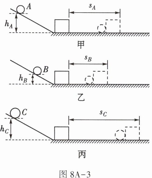 3. 如图8A-3所示,在“探究物体的动能与哪些因素有关”的实验中,使A、B、C三个小球先后从同一斜面的$h_A、$$h_B、$$h_C$高处滚下$(m_A = m_B $< m_C,h_A = h_C >$ h_B),$推动木块运动一段距离后静止。