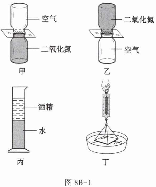 【分析】(1)图甲中,二氧化氮的密度大于空气的密度,它运动到上面的瓶子内,能够说明气体分子在不停地做无规则运动。图乙中,密度大的二氧化氮气体在上方,抽去玻璃板后,由于重力的作用,二氧化氮气体会向下运动,所以不能完全说明气体分子在不停地做无规则运动。故更合理的是甲方案。(2)分子在不停地做无规则运动,说明分子间存在间隙,所以酒精和水混合后的总体积小于酒精和水的体积之和。(3)玻璃和水接触在一起,由于分子间存在引力,故向上拉玻璃板时,弹簧测力计的示数将变大。