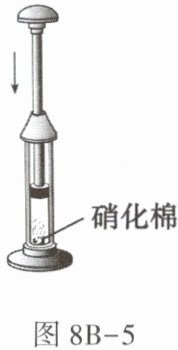 6. 如图8B-5所示,在空气压缩引火仪的玻璃筒底部,放入一小团硝化棉,用力将活塞迅速下压,玻璃筒内的空气温度升高,空气的内能____(选填“增加”或“减少”),空气的内能是通过____的方式改变的;玻璃筒内的硝化棉由于温度升高达到硝化棉的燃点而燃烧,硝化棉的内能是通过____的方式改变的。