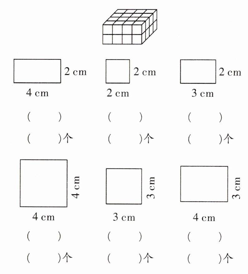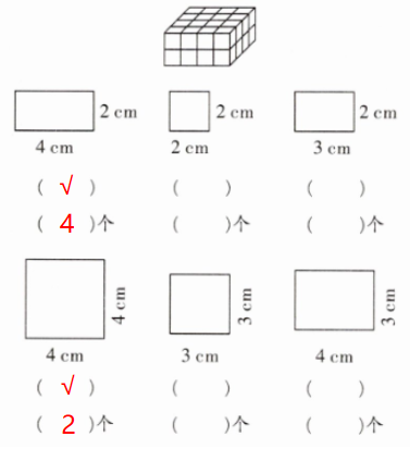 四、下图是用边长1cm的小正方体拼成的长方体。下面的图形哪一个是这个长方体6个面中的一个?用“√”标出来,并注明有几个这样的面。