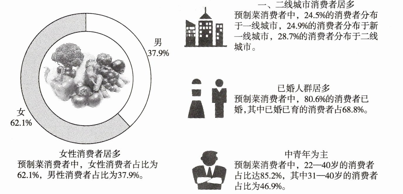 (2)①国家加强预制菜食品安全监管,制定预制菜食品安全国家标准;②预制菜消费者中,女性占比62.1%,明显多于男性。
