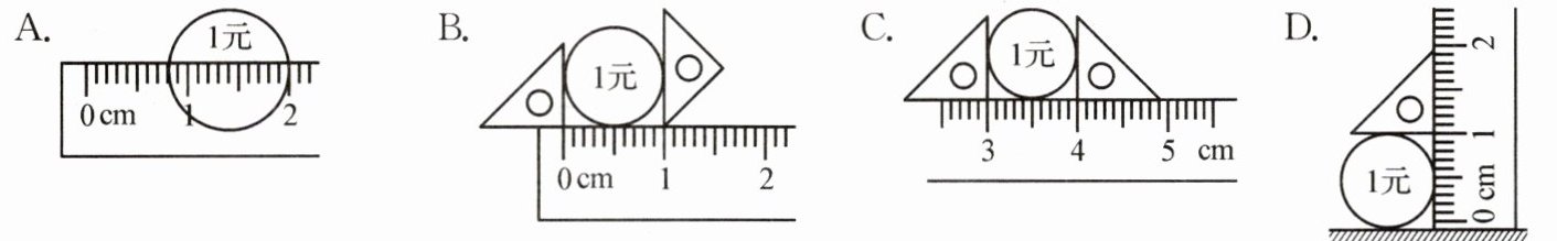 4. 小吴想测量1角硬币的直径,下列测量方法最佳的是()。