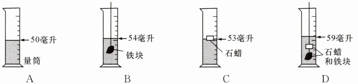 8. 石蜡不能沉入水中,为了测量石蜡的体积,小红采用如图所示的方法,在图中______(填字母)是没有必要的,石蜡的体积是______。