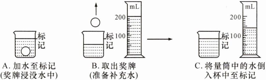 10. 小明准备测量奖牌的体积,但因奖牌体积较大,放不进量筒,因此利用一只烧杯,按如图方法进行测量。问: