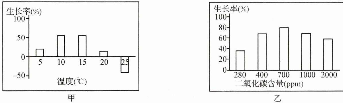 8. 海带有“长寿菜”“含碘冠军”的美誉,海带的生长与生活环境密切相关。某科研小组做了以下两个实验,探究温度或二氧化碳对海带生长率(实验前后,海带体内物质增加的比率)的影响,实验结果如图所示(注:25℃时海带腐烂,所以生长率为负值),请分析回答下列有关问题:
